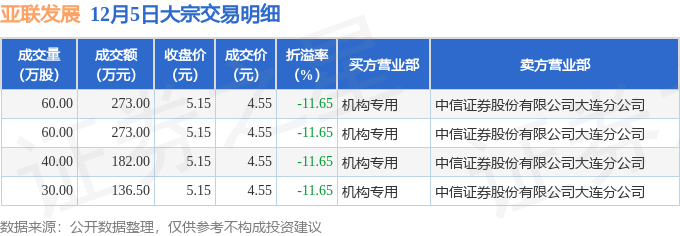 证券之星消息,12月5日亚联发展发生大宗交易,交易数据如下: