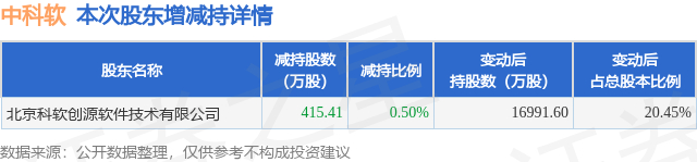 证券之星消息,12月5日中科软发布公告《中科软:中科软股东减持股份结果公告》,其股东北京科软创源软件技术有限公司于2025年11月28日至2025年12月5日间合计减持415.41万股,占公司目前总股本的0.4999%,变动期间该股股价下跌0.71%,截止12月5日收盘报19.62元。