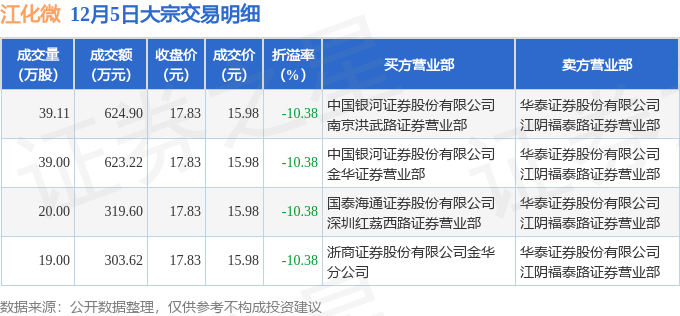 证券之星消息,12月5日江化微发生大宗交易,交易数据如下: