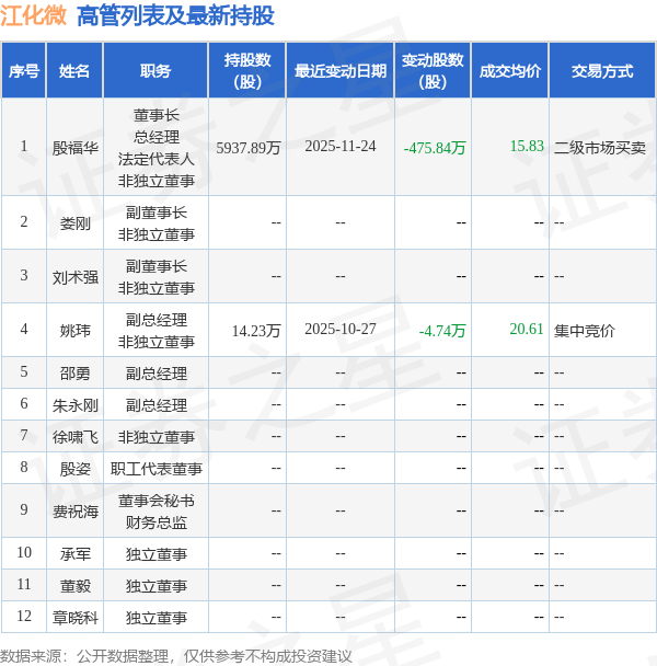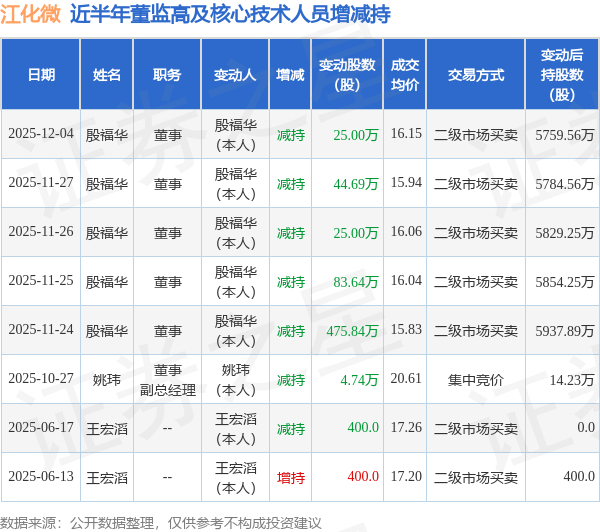 江化微近半年内的董监高及核心技术人员增减持详情如下: