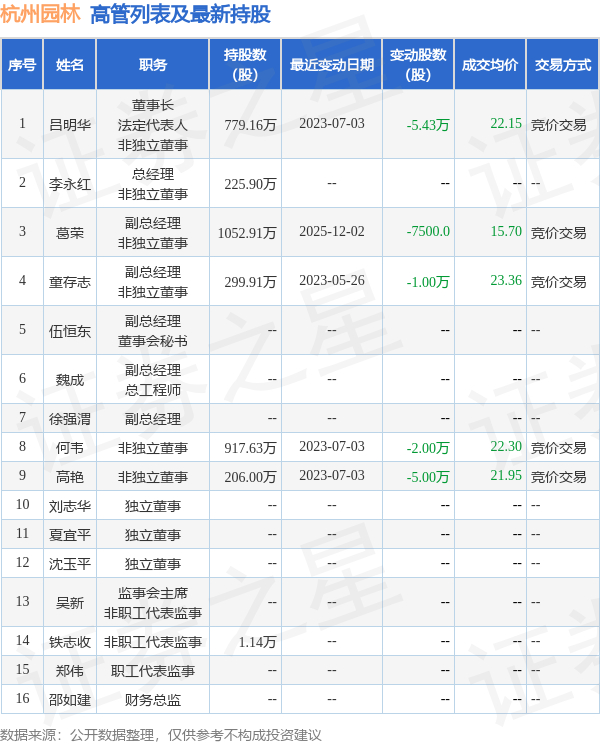 杭州园林近半年内的董监高及核心技术人员增减持详情如下: