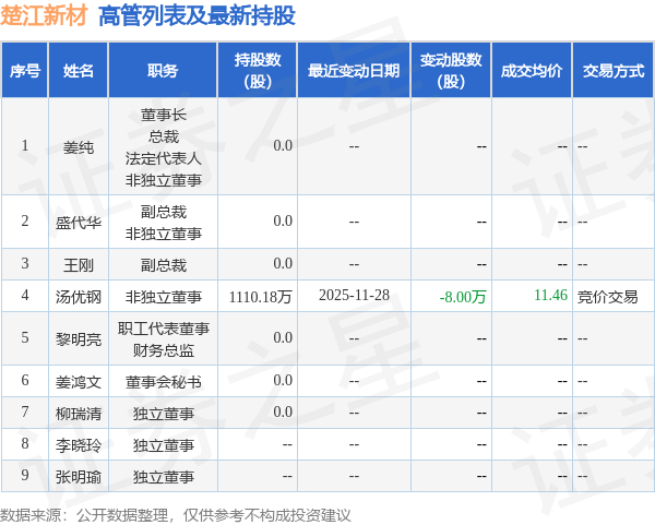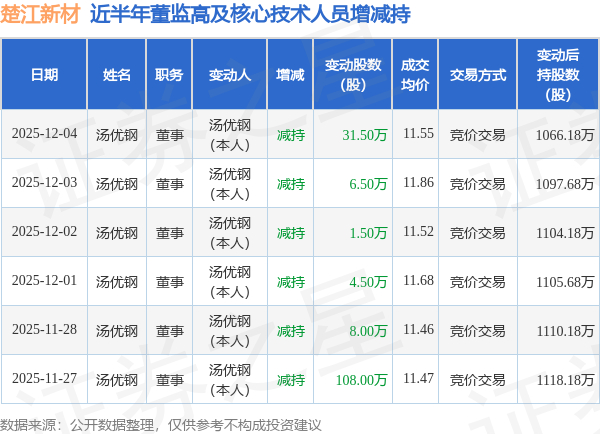 证券之星消息,根据12月5日市场公开信息、上市公司公告及交易所披露数据整理,楚江新材(002171)最新董监高及相关人员股份变动情况:2025年12月4日公司董事汤优钢共减持公司股份31.5万股,占公司总股本为0.0194%。变动期间公司股价下跌1.95%,12月4日当日收盘报11.54元。