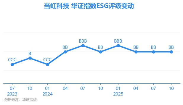 日前,华证指数公布了新一期(2025年10月31日)的ESG评级结果,当虹科技(688039.SH)获得BB评级(华证指数评级为C起至AAA九档,C为最低档,AAA为其最高一级评级/AA为其第二档),上一期(2025年7月31日)ESG评级为BB。本期ESG评级在165家软件行业A股上市公司中排名第51(上一期排名第53)。