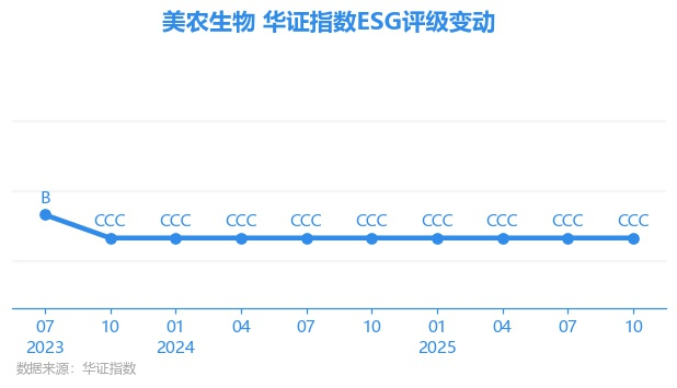 日前,华证指数公布了新一期(2025年10月31日)的ESG评级结果,美农生物(301156.SZ)获得CCC评级(华证指数评级为C起至AAA九档,C为最低档,AAA为其最高一级评级/AA为其第二档),上一期(2025年7月31日)ESG评级为CCC。本期ESG评级在168家食品行业A股上市公司中排名第64(上一期排名第75)。