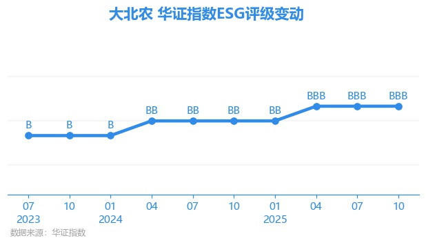 日前,华证指数公布了新一期(2025年10月31日)的ESG评级结果,大北农(002385.SZ)获得BBB评级(华证指数评级为C起至AAA九档,C为最低档,AAA为其最高一级评级/AA为其第二档),上一期(2025年7月31日)ESG评级为BBB。本期ESG评级在168家食品行业A股上市公司中排名第27(上一期排名第25)。