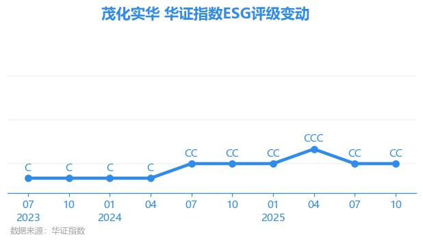 日前,华证指数公布了新一期(2025年10月31日)的ESG评级结果,茂化实华(000637.SZ)获得CC评级(华证指数评级为C起至AAA九档,C为最低档,AAA为其最高一级评级/AA为其第二档),上一期(2025年7月31日)ESG评级为CC。本期ESG评级在494家化学制品行业A股上市公司中排名第453(上一期排名第405)。