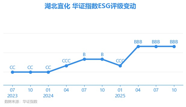 日前,华证指数公布了新一期(2025年10月31日)的ESG评级结果,湖北宜化(000422.SZ)获得BBB评级(华证指数评级为C起至AAA九档,C为最低档,AAA为其最高一级评级/AA为其第二档),上一期(2025年7月31日)ESG评级为BBB。本期ESG评级在494家化学制品行业A股上市公司中排名第116(上一期排名第102)。