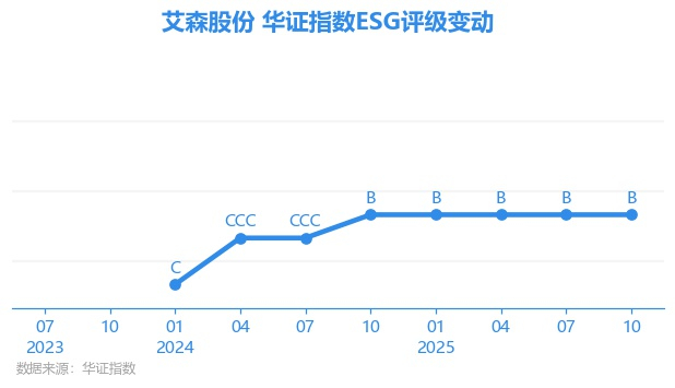 日前,华证指数公布了新一期(2025年10月31日)的ESG评级结果,艾森股份(688720.SH)获得B评级(华证指数评级为C起至AAA九档,C为最低档,AAA为其最高一级评级/AA为其第二档),上一期(2025年7月31日)ESG评级为B。本期ESG评级在494家化学制品行业A股上市公司中排名第233(上一期排名第226)。