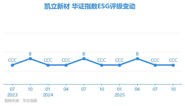 日前,华证指数公布了新一期(2025年10月31日)的ESG评级结果,凯立新材(688269.SH)获得CCC评级(华证指数评级为C起至AAA九档,C为最低档,AAA为其最高一级评级/AA为其第二档),上一期(2025年7月31日)ESG评级为CCC。本期ESG评级在494家化学制品行业A股上市公司中排名第371(上一期排名第345)。