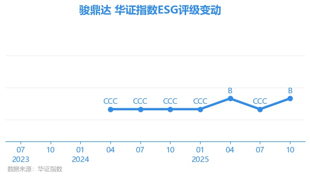 日前,华证指数公布了新一期(2025年10月31日)的ESG评级结果,骏鼎达(301538.SZ)获得B评级(华证指数评级为C起至AAA九档,C为最低档,AAA为其最高一级评级/AA为其第二档),上一期(2025年7月31日)ESG评级为CCC。本期ESG评级在494家化学制品行业A股上市公司中排名第239(上一期排名第250)。