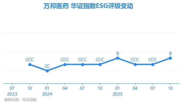 日前,华证指数公布了新一期(2025年10月31日)的ESG评级结果,万邦医药(301520.SZ)获得B评级(华证指数评级为C起至AAA九档,C为最低档,AAA为其最高一级评级/AA为其第二档),上一期(2025年7月31日)ESG评级为CCC。本期ESG评级在266家制药行业A股上市公司中排名第135(上一期排名第190)。