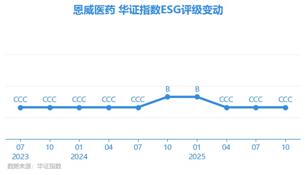 日前,华证指数公布了新一期(2025年10月31日)的ESG评级结果,恩威医药(301331.SZ)获得CCC评级(华证指数评级为C起至AAA九档,C为最低档,AAA为其最高一级评级/AA为其第二档),上一期(2025年7月31日)ESG评级为CCC。本期ESG评级在266家制药行业A股上市公司中排名第198(上一期排名第188)。