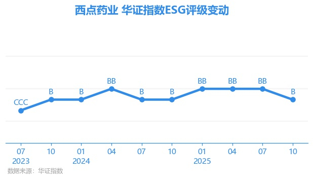 日前,华证指数公布了新一期(2025年10月31日)的ESG评级结果,西点药业(301130.SZ)获得B评级(华证指数评级为C起至AAA九档,C为最低档,AAA为其最高一级评级/AA为其第二档),上一期(2025年7月31日)ESG评级为BB。本期ESG评级在266家制药行业A股上市公司中排名第124(上一期排名第112)。