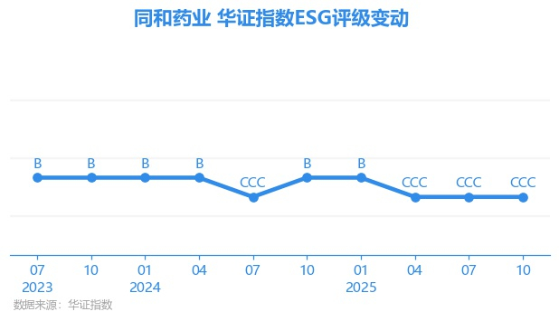 日前,华证指数公布了新一期(2025年10月31日)的ESG评级结果,同和药业(300636.SZ)获得CCC评级(华证指数评级为C起至AAA九档,C为最低档,AAA为其最高一级评级/AA为其第二档),上一期(2025年7月31日)ESG评级为CCC。本期ESG评级在266家制药行业A股上市公司中排名第213(上一期排名第199)。
