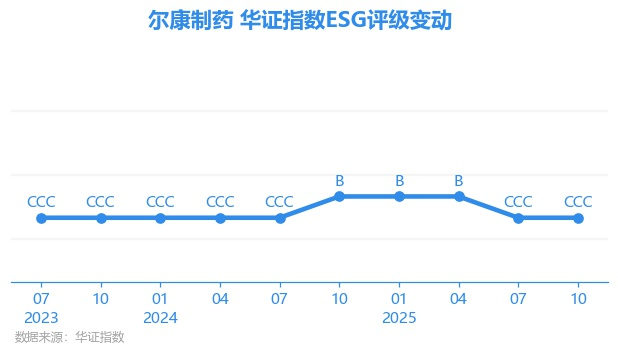 日前,华证指数公布了新一期(2025年10月31日)的ESG评级结果,尔康制药(300267.SZ)获得CCC评级(华证指数评级为C起至AAA九档,C为最低档,AAA为其最高一级评级/AA为其第二档),上一期(2025年7月31日)ESG评级为CCC。本期ESG评级在266家制药行业A股上市公司中排名第192(上一期排名第182)。