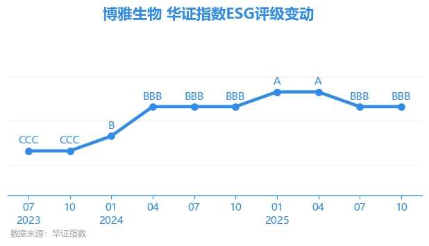 日前,华证指数公布了新一期(2025年10月31日)的ESG评级结果,博雅生物(300294.SZ)获得BBB评级(华证指数评级为C起至AAA九档,C为最低档,AAA为其最高一级评级/AA为其第二档),上一期(2025年7月31日)ESG评级为BBB。本期ESG评级在75家生物科技行业A股上市公司中排名第24(上一期排名第21)。