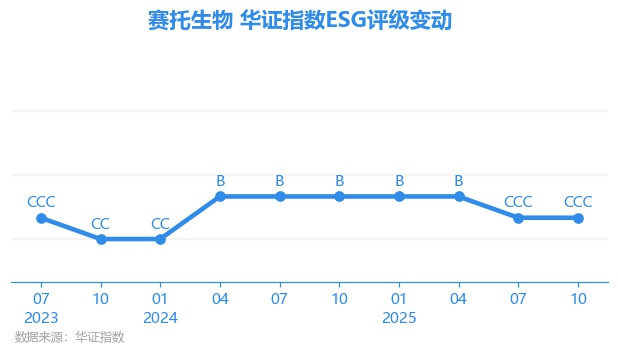 日前,华证指数公布了新一期(2025年10月31日)的ESG评级结果,赛托生物(300583.SZ)获得CCC评级(华证指数评级为C起至AAA九档,C为最低档,AAA为其最高一级评级/AA为其第二档),上一期(2025年7月31日)ESG评级为CCC。本期ESG评级在266家制药行业A股上市公司中排名第191(上一期排名第183)。
