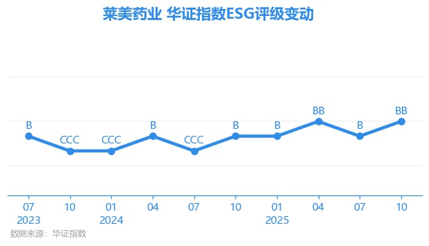 日前,华证指数公布了新一期(2025年10月31日)的ESG评级结果,莱美药业(300006.SZ)获得BB评级(华证指数评级为C起至AAA九档,C为最低档,AAA为其最高一级评级/AA为其第二档),上一期(2025年7月31日)ESG评级为B。本期ESG评级在266家制药行业A股上市公司中排名第106(上一期排名第119)。