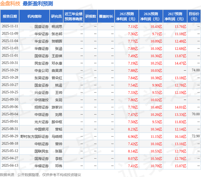 金盘科技2025年三季报显示,前三季度公司主营收入51.94亿元,同比上升8.25%;归母净利润4.86亿元,同比上升20.27%;扣非净利润4.56亿元,同比上升19.05%;其中2025年第三季度,公司单季度主营收入20.4亿元,同比上升8.38%;单季度归母净利润2.21亿元,同比上升21.71%;单季度扣非净利润2.1亿元,同比上升22.77%;负债率53.99%,投资收益148.2万元,财务费用3200.91万元,毛利率26.08%。