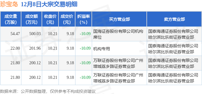 证券之星消息,12月8日珍宝岛发生大宗交易,交易数据如下: