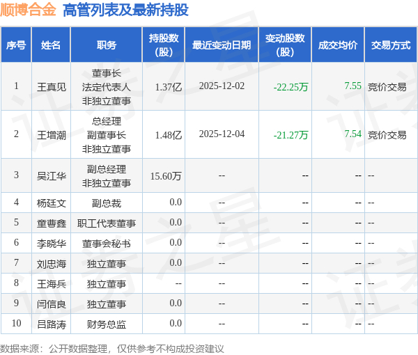 证券之星消息,根据12月8日市场公开信息、上市公司公告及交易所披露数据整理,顺博合金(002996)最新董监高及相关人员股份变动情况:2025年12月5日公司董事,高管王增潮共减持公司股份113.75万股,占公司总股本为0.1699%。变动期间公司股价上涨3.05%,12月5日当日收盘报7.76元。