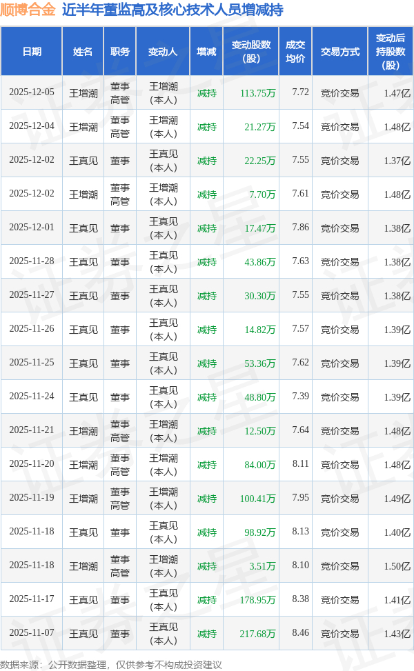 顺博合金近半年内的董监高及核心技术人员增减持详情如下:
