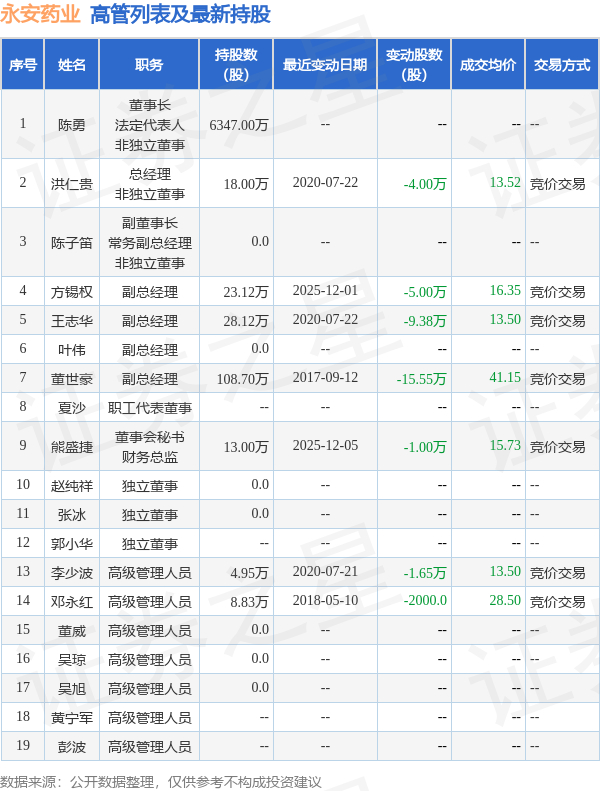 永安药业近半年内的董监高及核心技术人员增减持详情如下: