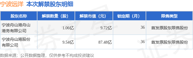 证券之星消息,根据市场公开信息整理,宁波远洋(601022)于12月9日将有10.6亿股限售股份解禁,为公司首发原股东限售股份,占公司总股本81.0%。(本次数据根据历史公告整理得出,实际情况以上市公司最新公告为准)本次解禁后,公司已无限售股份。具体如下图所示: