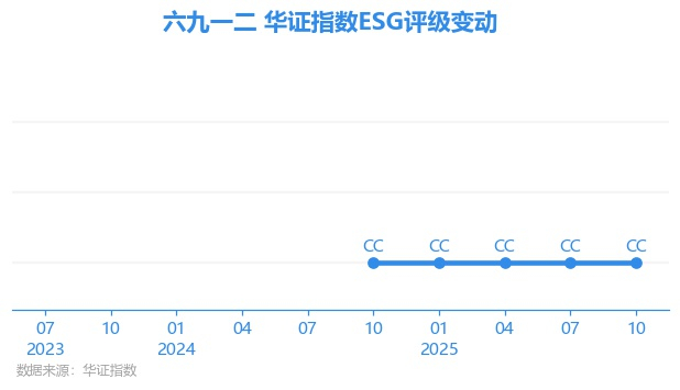 日前,华证指数公布了新一期(2025年10月31日)的ESG评级结果,六九一二(301592.SZ)获得CC评级(华证指数评级为C起至AAA九档,C为最低档,AAA为其最高一级评级/AA为其第二档),上一期(2025年7月31日)ESG评级为CC。本期ESG评级在72家航空航天与国防行业A股上市公司中排名第55(上一期排名第54)。