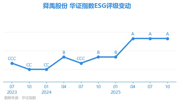 日前,华证指数公布了新一期(2025年10月31日)的ESG评级结果,舜禹股份(301519.SZ)获得A评级(华证指数评级为C起至AAA九档,C为最低档,AAA为其最高一级评级/AA为其第二档),上一期(2025年7月31日)ESG评级为A。本期ESG评级在492家机械制造行业A股上市公司中排名第37(上一期排名第38)。