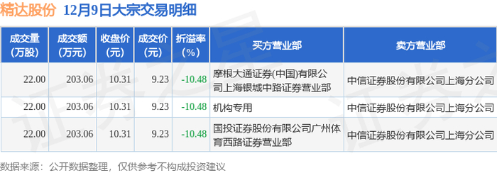 证券之星消息,12月9日精达股份发生大宗交易,交易数据如下: