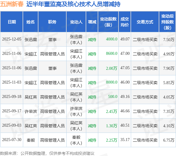 五洲新春近半年内的董监高及核心技术人员增减持详情如下: