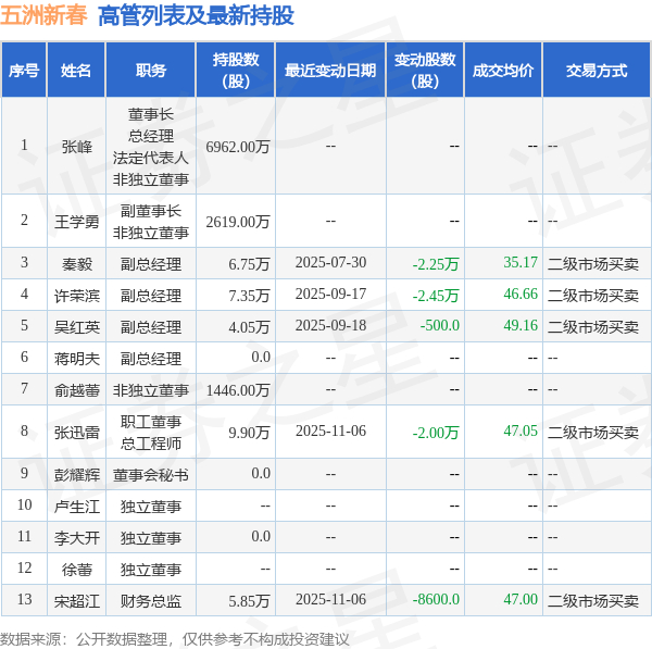 五洲新春的高管列表及最新持股情况如下: