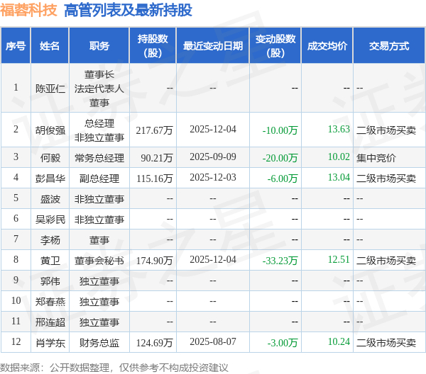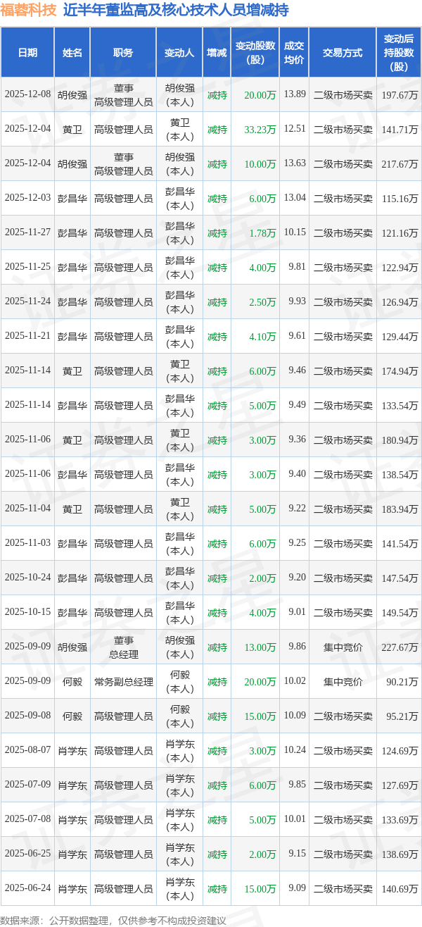 福蓉科技近半年内的董监高及核心技术人员增减持详情如下: