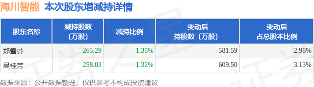 证券之星消息,12月9日海川智能发布公告《海川智能:关于公司股东减持股份实施情况的公告》,其股东郑雪芬、吴桂芳于2025年9月9日至2025年12月8日间合计减持523.32万股,占公司目前总股本的2.6854%,变动期间该股股价上涨18.21%,截止12月8日收盘报32.0元。