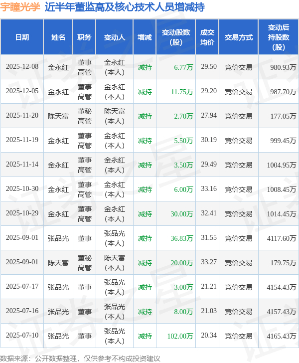 宇瞳光学近半年内的董监高及核心技术人员增减持详情如下: