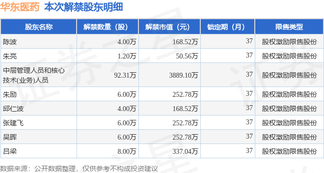 证券之星消息,根据市场公开信息整理,华东医药(000963)于12月10日将有127.51万股限售股份解禁,为公司股权激励限售股份,占公司总股本0.07%。(本次数据根据历史公告整理得出,实际情况以上市公司最新公告为准)最近一年内,该股累计解禁123.87万股,占总股本的0.07%。本次解禁后,公司还有64.57万股限售股份,占总股本0.04%。具体如下图所示: