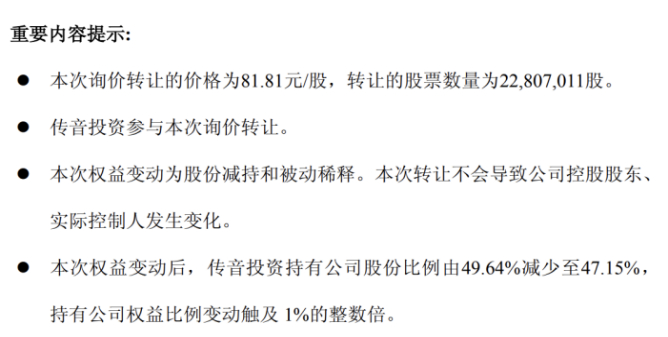 9月12日,公司发布公告称,深圳市传音投资有限公司(以下简称“传音投资”)因自身资金需求,通过询价转让减持2280.7万股,占公司总股本的比例约为2%,转让价格为81.81元/股,套现18.66亿元。本次权益变动后,传音投资持有公司股份比例由49.64%减少至47.15%。