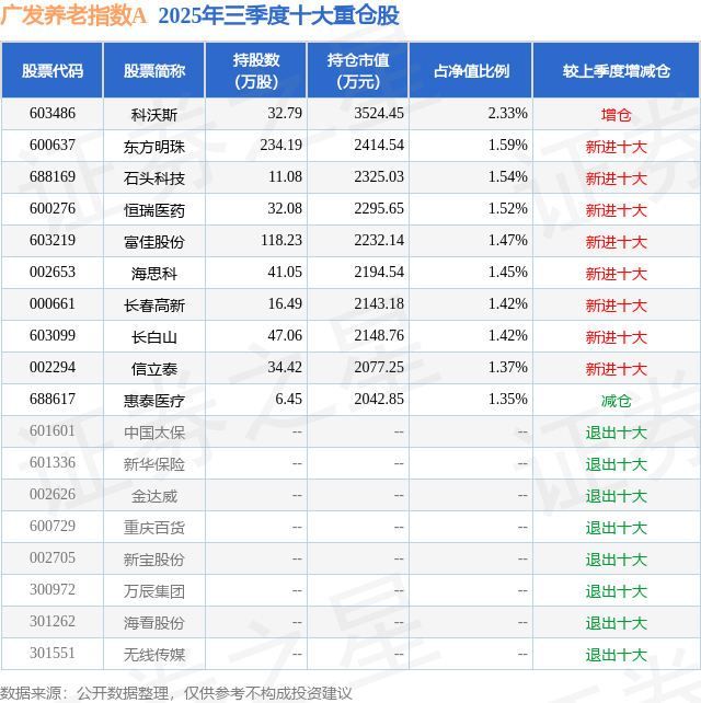 根据2025基金Q3季报公募基金重仓股数据,重仓该股的公募基金共5家,其中持有数量最多的公募基金为广发基金的广发养老指数A。广发养老指数A目前规模为13.95亿元,最新净值0.9539(12月9日),较上一交易日下跌0.63%,近一年上涨4.67%。该公募基金现任基金经理为曹世宇。曹世宇在任的基金产品包括:广发美国房地产指数人民币(QDII)A,管理时间为2023年12月13日至今,期间收益率为13.54%;广发中证全指金融地产联接A,管理时间为2023年12月13日至今,期间收益率为42.07%;广发国证半导体芯片ETF,管理时间为2023年12月13日至今,期间收益率为80.25%;广发中证全指金融地产ETF,管理时间为2023年12月13日至今,期间收益率为45.62%。