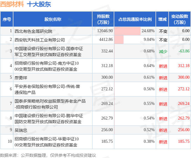 根据西部材料2025年三季报公布的十大股东详情如下: