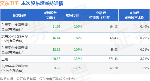 证券之星消息,12月10日奕东电子发布公告《奕东电子:关于控股股东、实际控制人的一致行动人减持股份触及1%整数倍的提示性公告》,其股东东莞奕宁投资咨询企业(有限合伙)、东莞奕萃投资咨询企业(有限合伙)、东莞奕合投资咨询企业(有限合伙)、王刚、东莞奕孚投资咨询企业(有限合伙)于2025年12月8日至2025年12月9日间合计减持234.64万股,占公司目前总股本的1.0%,变动期间该股股价上涨10.58%,截止12月9日收盘报46.09元。