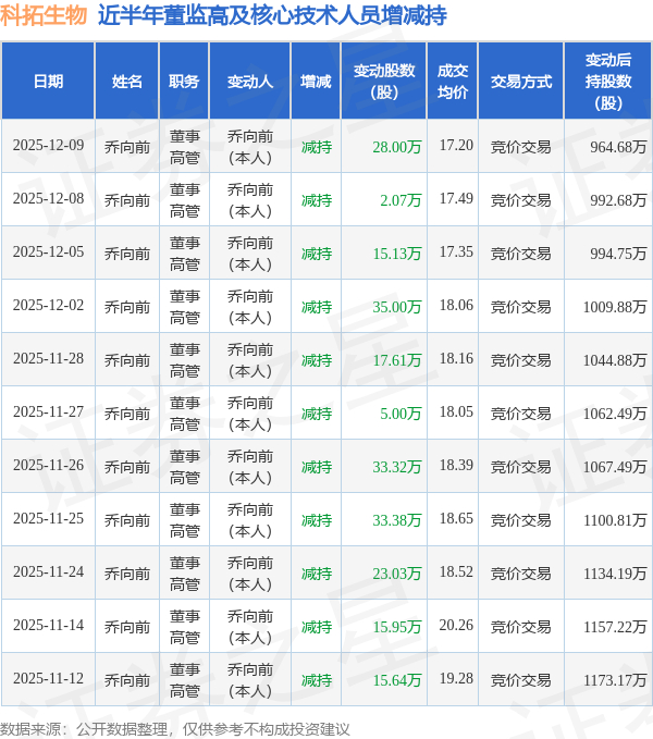 科拓生物近半年内的董监高及核心技术人员增减持详情如下:
