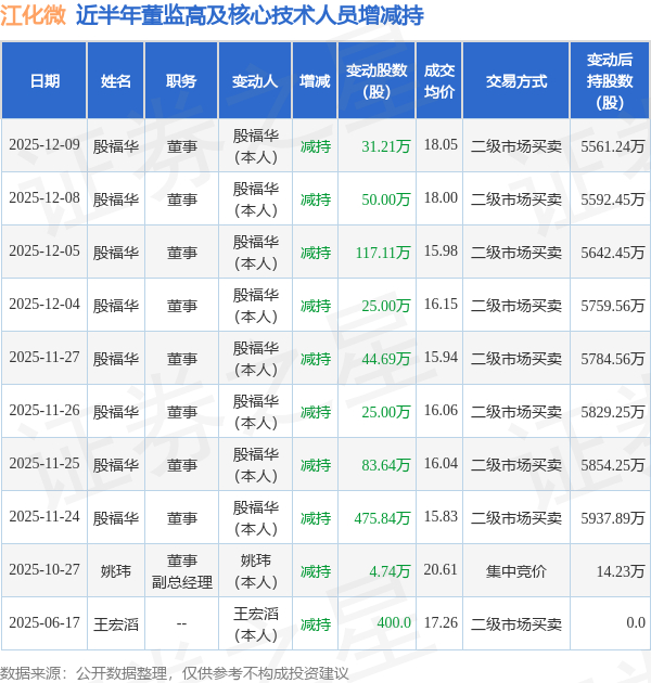 江化微近半年内的董监高及核心技术人员增减持详情如下: