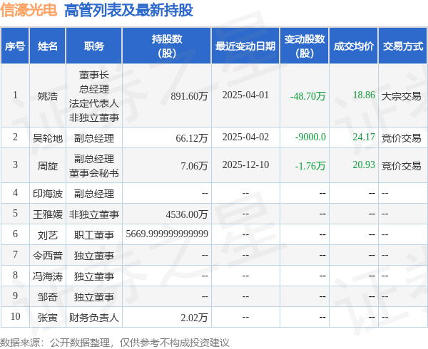 证券之星消息,根据12月11日市场公开信息、上市公司公告及交易所披露数据整理,信濠光电(301051)最新董监高及相关人员股份变动情况:2025年12月10日公司董秘,高管周旋共减持公司股份1.76万股,占公司总股本为0.0087%。变动期间公司股价下跌1.04%,12月10日当日收盘报20.85元。