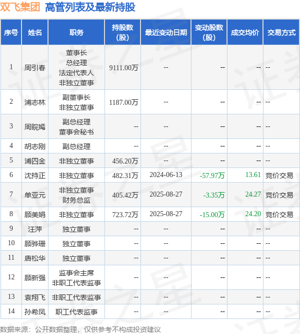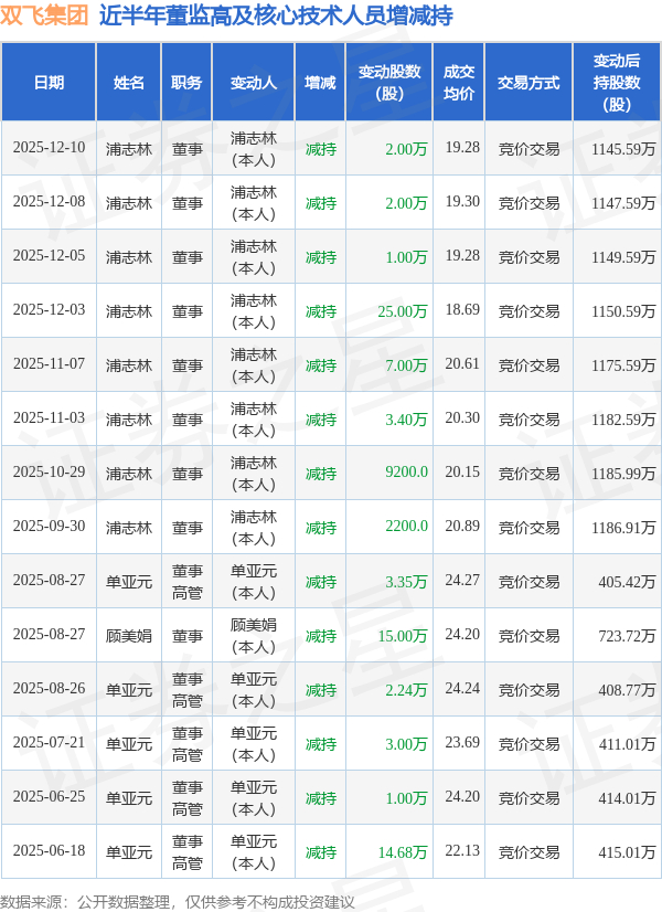 双飞集团近半年内的董监高及核心技术人员增减持详情如下: