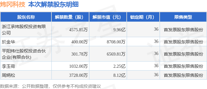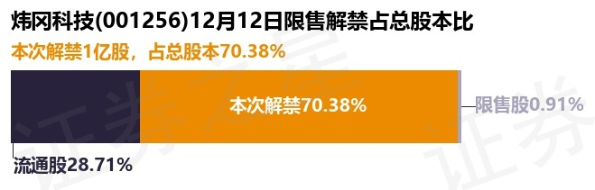 证券之星消息,根据市场公开信息整理,炜冈科技(001256)于12月12日将有1.0亿股限售股份解禁,为公司首发原股东限售股份,占公司总股本70.38%。(本次数据根据历史公告整理得出,实际情况以上市公司最新公告为准)本次解禁后,公司还有129.34万股限售股份,占总股本0.91%。具体如下图所示: