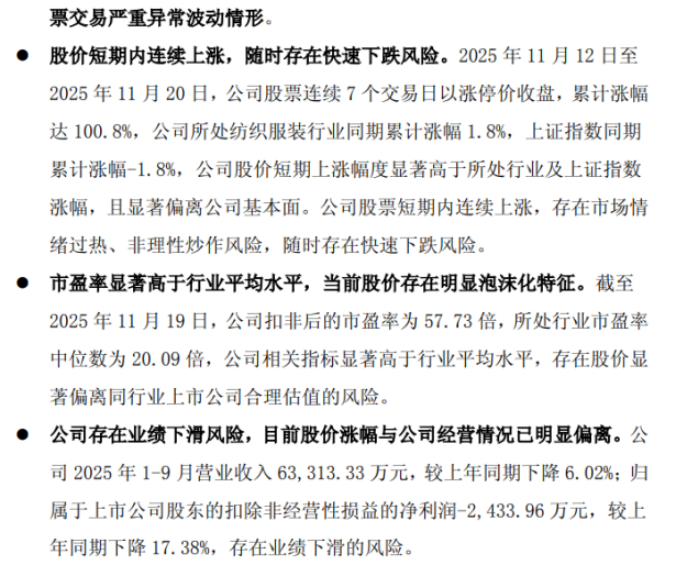 值得关注的是,公司股价在11月出现异常波动:先是连续10个交易日内累计涨幅超100%,其中11月12日至20日更是连续7个交易日涨停;随后自11月21日起,又连续三个交易日累计跌幅超20%,快速回吐了此前部分涨幅。