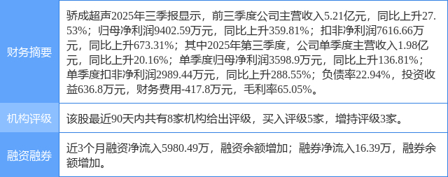 2025年10月30日,东吴证券研究员曾朵红,阮巧燕,朱家佟发布了对骄成超声的研报《2025年三季报点评:业绩符合预期,先进封装实现突破》,该研报对骄成超声给出“买入”评级。研报中预计公司25-27年归母净利1.3/2.4/4.1亿元(此前预期1.5/3.0/5.0亿元),同比+57%/+75%/+72%,对应PE99/57/33x,维持“买入”评级。证券之星数据中心根据近三年发布的研报数据计算,该研报作者对此股的盈利预测准确度为72.59%。