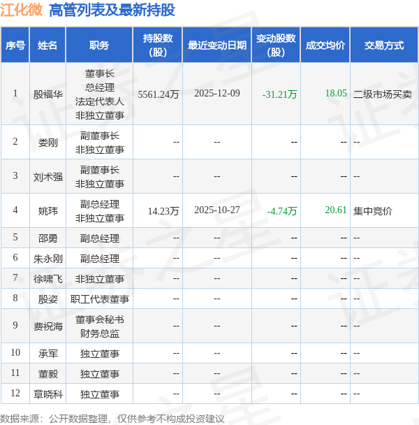 江化微的高管列表及最新持股情况如下: