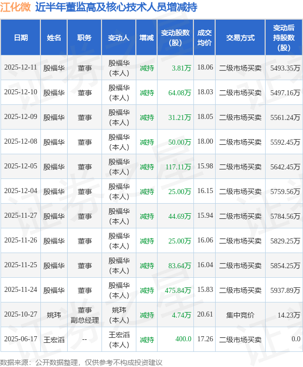 江化微近半年内的董监高及核心技术人员增减持详情如下: